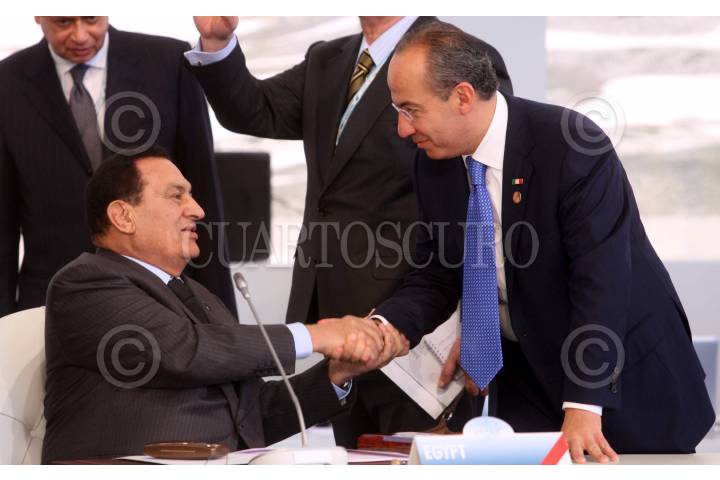L´AQUILA, LOS ABRUZOS, ITALIA, 09JULIO2009.- Felipe Calderón Hinojosa, presidente de México, dialoga con Hosni Mubarak, presidente de Egipto, durante el congreso del grupo del G-8, G-5 y Egipto "Asuntos Globales", que tuvo lugar en la escuela de Suboficiales de la Guardia de Finanzas. FOTO: ALFREDO GUERRERO/CUARTOSCURO.COM
