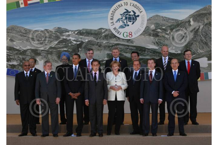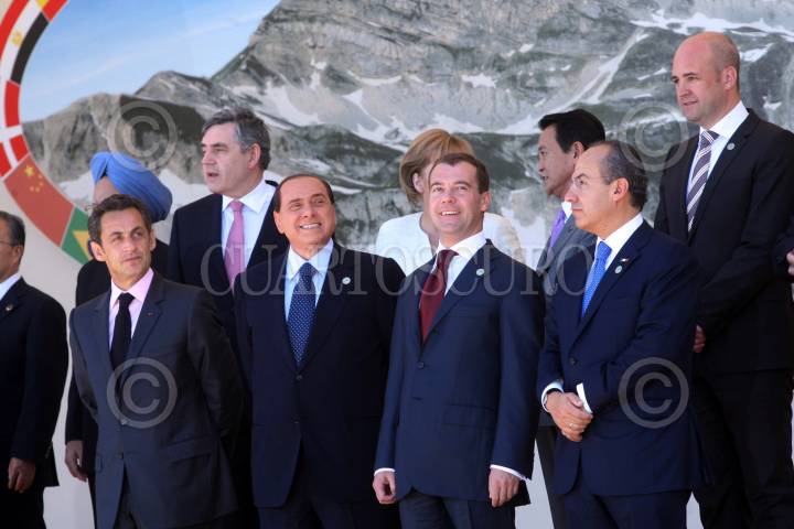 L´AQUILA, LOS ABRUZOS, ITALIA, 09JULIO2009.- Felipe Calderón Hinojosa, presidente de México, junto con los representantes de los diferentes países miembros del grupo del G-8 y G-5, durante la toma de la fotografía oficial del evento. FOTO: ALFREDO GUERRERO/CUARTOSCURO.COM