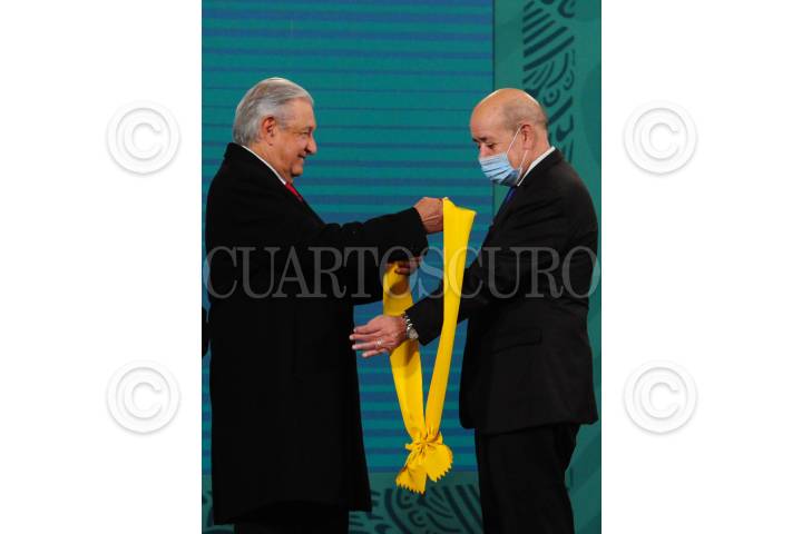 Jean-Yves Le Drian, ministro de relaciones exteriores de Francia, recibe la condecoración del Águila Azteca durante la conferencia mañanera.