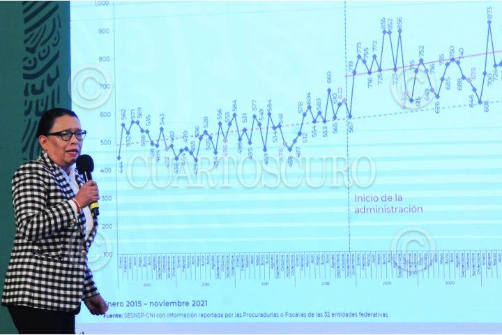 Rosa Icela Rodríguez, titular de la SSPC, durante su participación en la conferencia mañanera.
