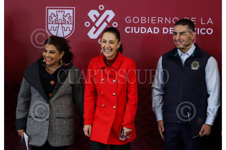 La alcaldesa Clara Brugada, La Jefa de Gobierno Claudia Sheinbaum y el Secretario de Seguridad Ciudadana Omar García Harfuch durante la Instalación del Gabinete de Seguridad y Mesas de Construcción de Paz en la Alcaldía Iztapalapa.