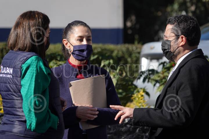 Alfa Eliana González, Claudia Sheinbaum y Martí Batres previo a la conferencia tras la instalación del gabinete de seguridad en Tlalpan.
