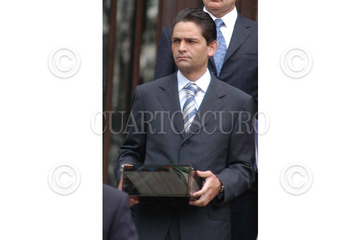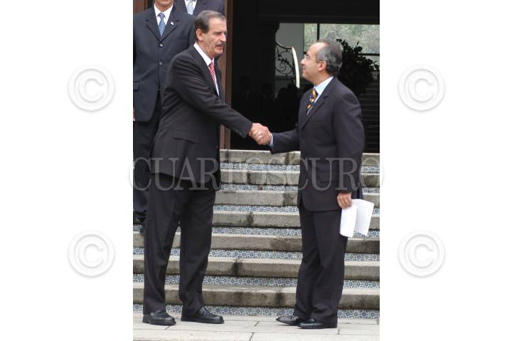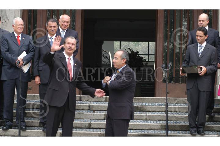 MEXICO D.F. 21SEPTIEMBRE2006.- El presidente Vicente Fox Quesada se reunio con Felipe Calderón Hinojosa, presidente electo en la residencia oficial de Los Pinos, atras Juan Camilo Mouriño, coordinador general del equipo de transición lleva los libros blancos de la administración federal. FOTO: GERMÁN ROMERO/CUARTOSCURO.COM
