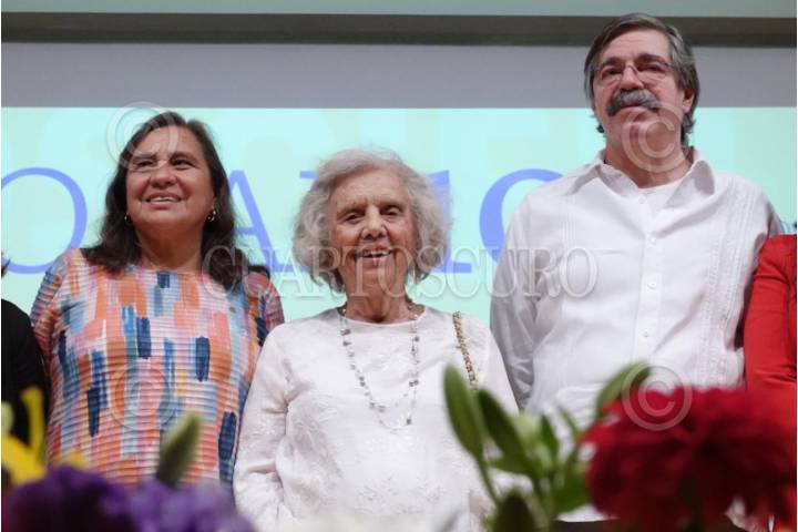 CIUDAD DE MÉXICO, 25MAYO2025.- Las escritoras Leticia Bonifaz, Elena Poniatowska y Gabriel Guerra Castellanos, hijo de Rosario Castellanos, durante el Conversatorio "Rosario Castellanos, mujer de palabras y miradas", dentro de las actividades de su Homenaje por el Aniversario de su Centenario. El acto se realizó en la Sala Manuel. M. Ponce, en el Palacio de Bellas Artes. FOTO: GRACIELA LÓPEZ/CUARTOSCURO.COM
