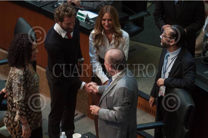 MÉXICO, D.F., 14ABRIL2015.- Los actores Gabriel Soto y Gerladine Bazán saluda al senador Ernesto Ruffo Appel y a Mariana Gómez del Campo, durante la sesión en el Senado. Soto y Bazán acudieron a la conferencia en donde el senador Maro Antonio Básquez presentó una iniciativa del ley en la cual se busca proteger a los deportistas profesionales que realizan disciplinas como lucha libre, box y artes marciales. FOTO: MOISÉS PABLO /CUARTOSCURO.COM