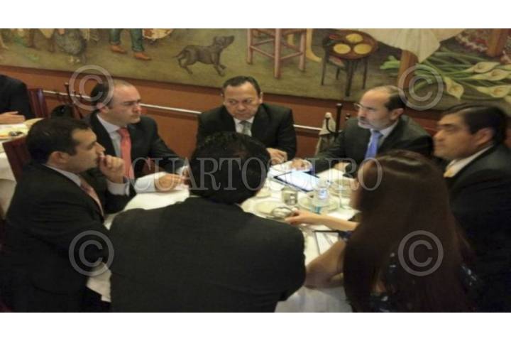 MÉXICO, D.F., 27AGOSTO2012.- Ernesto Cordero, nuevo presidente de la mesa directiva del Senado de la República, Jesus Zambrano, presidente de la mesa directiva del PRD, Gustavo Madero, presidente del PAN, Miguel Barboza, senador del PRD, y Gabriela Cuevas, senadore del PAN, charlan durante una reunión privada que sostuvieron esta mañana en la cual revisaron la agenda legislativas. FOTO: TWITTER /CUARTOSCURO.COM