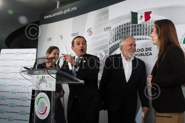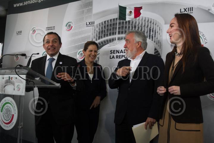 CIUDAD DE MÉXICO, 15FEBRERO2018.- Los senadores independientes Marha Tagle, Alejandro Encinas, y Gabriela Cuevas, anunciaron que formarán una coalición legislativa, ya que denunciaron que siendo independientes los partidos políticos los marginan de las comisiones y otras actividades parlamentarias. Al final Ernesto Cordero, presidente de la mesa directiva, bromeo con ellos de sumarse a esta coalición, ya que en los últimos días ha dejado entrever que en el PAN ya no se encuentra a gusto. FOTO: MOISÉS PABLO /CUARTOSCURO.COM
