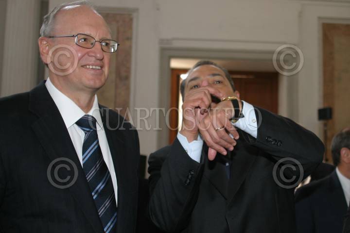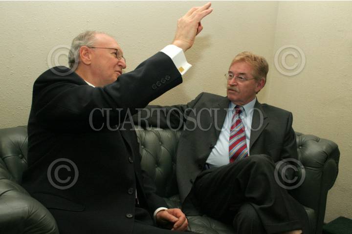 MEXICO, D.F. 25ENERO2004.- En el palacio de Minería se celebró la ceremonia de inauguración de la XIII Reunión Interparlamentaria México-Canadá. El diputado Manlio Fabio Beltrones, le señala la hora al senador Diego Fernández de Cevallos que se encontraba dando declaraciones a los medios de informanción. En la imagen el embajador Gaêtan Lavertu. FOTO: Sandra Perdomo/CUARTOSCURO.COM