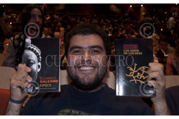 MÉXICO, D.F., 05NOVIEMBRE2012.- El escritor uruguayo, Eduardo Galeano, presentó su libro "Los Hijos de los Días", ante una Sala Nezahualcoyotl abarrotada por estudiantes de la UNAM. En la foto, el estudiante de derecho, Roberto Antonio Cabrera, quien dice haber llegado al auditorio a las 04:00 A.M, enseña los libros de su autor favorito. FOTO: CHRISTIAN DAVIS /CUARTOSCURO.COM