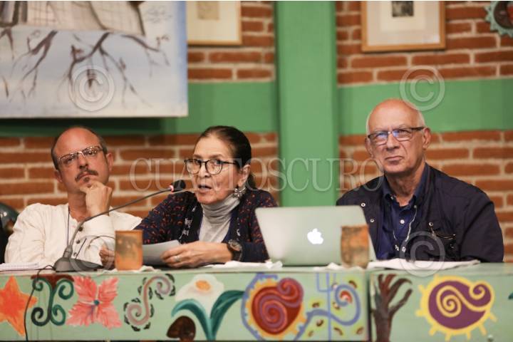 SAN CRISTÓBAL DE LAS CASAS, CHIAPAS, 17ABRIL2018.- Alejandro Grimson, Alicia Castellanos y Gilberto López y Rivas, integrantes de la asociación civil "Llegó la hora del florecimiento de los pueblos", durante el segundo día del conversatorio "Miradas, escuchas, palabras: ¿prohibido pensar?", encuentro entre el Concejo Indígena de Gobierno, las redes de apoyo del CIG, periodistas y artistas y el Ejército Zapatista de Liberación Nacional (EZLN) para hacer una evaluación sobre el recorrido y la participación del CIG y Marichuy como aspirante a candidata independiente. FOTO: DALIRI OROPEZA /CUARTOSCURO.COM