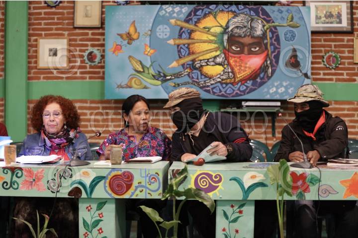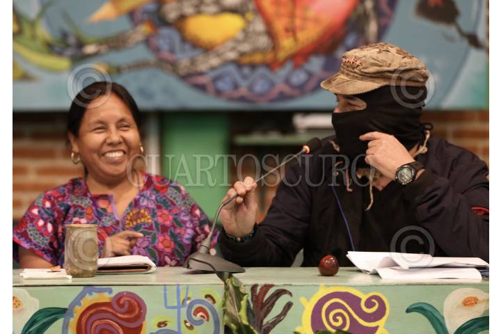 SAN CRISTÓBAL DE LAS CASAS, CHIAPAS, 17ABRIL2018.- Silvia Marcos, académica, María de Jesús Patricio Martínez (Marichuy), vocera del Concejo Indígena de Gobierno, el Subcomandante Insurgente Galeano y el Comandante Tacho, durante la tarde de ayer como primer día de actividades del conversatorio "Miradas, escuchas, palabras: ¿prohibido pensar?", encuentro entre el Concejo Indígena de Gobierno, las redes de apoyo del CIG, periodistas y artistas y el Ejército Zapatista de Liberación Nacional (EZLN) para hacer una evaluación sobre el recorrido y la participación del CIG y Marichuy como aspirante a candidata independiente. FOTO: DALIRI OROPEZA /CUARTOSCURO.COM