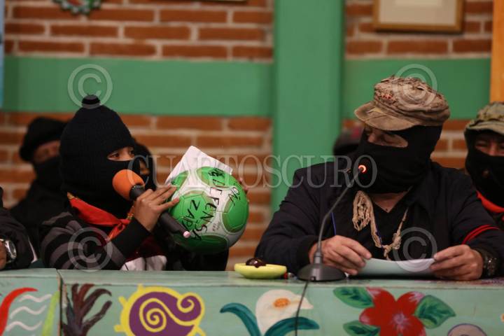 SAN CRISTÓBAL DE LAS CASAS, CHIAPAS, 19ABRIL2018.- Durante las actividades del Tercer día del conversatorio "Miradas, escuchas, palabras: ¿prohibido pensar?", encuentro entre el Concejo Indígena de Gobierno, las redes de apoyo del CIG, periodistas y artistas y el Ejército Zapatista de Liberación Nacional (EZLN), Defensa Zapatista, entregó balón con insignias a el Subcomandante Insurgente Galeano. FOTO: DALIRI OROPEZA /CUARTOSCURO.COM