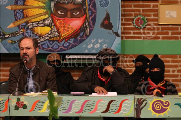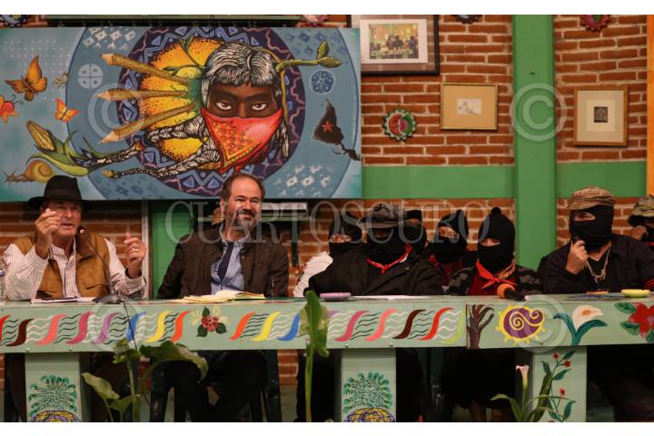 SAN CRISTOBAL DE LAS CASAS, 21ABRIL2018.- Subcomandante Galeano, Juan Villoro, periodista y escritor, Juan Carlos Rulfo, cineasta y Mardonio Carvallo, escritor, durante la séptima sesión de actividades en el conversatorio "Miradas, escuchas, palabras: ¿prohibido pensar?", encuentro entre el Concejo Indígena de Gobierno, las redes de apoyo del CIG, periodistas y artistas y el Ejército Zapatista de Liberación Nacional (EZLN) para hacer una evaluación sobre el recorrido y la participación del CIG y Marichuy como aspirante a candidata independiente. FOTO: DALIRI OROPEZA /CUARTOSCURO.COM