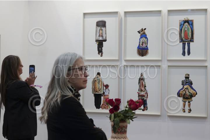 NAUCALPAN, ESTADO DE MÉXICO, 05FEBRERO2025.- Mujeres observan las piezas de la artista Alinka Echeverría titulada “Camino al Tepeyac” durante el primer día de actividades de la 21ª edición de ZONA MACO, la feria de arte más grande Latinoamérica, en el Centro de Exposiciones Citibanamex. En esta ocasión fueron convocadas galerías 199 galerías, así como proyectos artísticos provenientes de 27 países. FOTO: GALO CAÑAS/CUARTOSCURO.COM