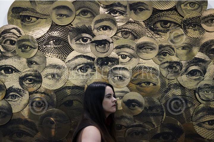 NAUCALPAN, ESTADO DE MÉXICO, 05FEBRERO2025.- Una mujer camina frente a la obra “Reflections in a Golden Eye II” de Carlos Aires en el primer día de actividades de la 21ª edición de ZONA MACO, la feria de arte más grande Latinoamérica, en el Centro de Exposiciones Citibanamex. En esta ocasión fueron convocadas galerías 199 galerías, así como proyectos artísticos provenientes de 27 países. FOTO: GALO CAÑAS/CUARTOSCURO.COM
