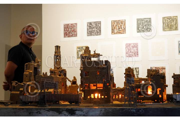 CIUDAD DE MÉXICO, 15MAYO2025.- Personas observan las piezas del artista plástico Alfonso Zarate durante el recorrido a medios de la exposición “Desde el corazón del Barrio. Tepito raíces profundas, voces que resuenan”, muestra colectiva que reúne a más de veinte artistas que viven, crean o mantienen vínculos estrechos con el barrio de Tepito y que podrá ser visitada en la Galería José María Velasco (GJMV), colonia Peralvillo, alcaldía Cuauhtémoc. FOTO: GALO CAÑAS/CUARTOSCURO.COM