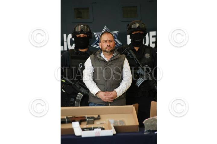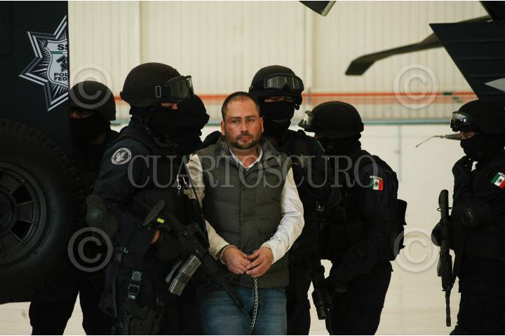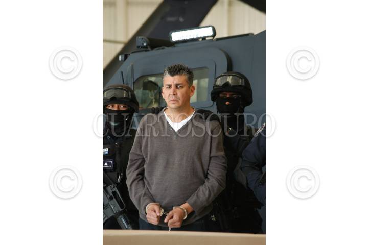 MÉXICO D.F., 28NOVIEMBRE2010.- Personal de la Secretaria de Seguridad Publica Federal, presentaron ante los medio de comunicación a Arturo Gallegos Castrellón, alias 'El Farmero', presunto líder de la organización delictiva de “Los Aztecas” y quien según las autoridades le atribuyen los homicidios de dos empleados del consulado estadounidense en Ciudad Juárez y la ejecución de 14 jóvenes en Villas de Salvárcar. FOTO: GUILLERMO PEREA/CUARTOSCURO.COM