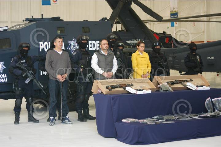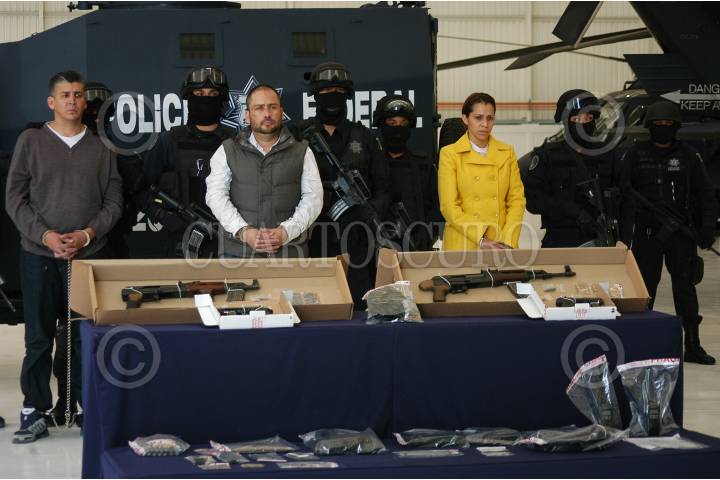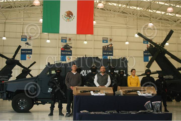 MÉXICO D.F., 28NOVIEMBRE2010.- Personal de la Secretaria de Seguridad Publica Federal, presentaron ante los medio de comunicación a Arturo Gallegos Castrellón, alias 'El Farmero', presunto líder de la organización delictiva de “Los Aztecas” y quien según las autoridades le atribuyen los homicidios de dos empleados del consulado estadounidense en Ciudad Juárez y la ejecución de 14 jóvenes en Villas de Salvárcar. También fueron presentados otros dos supuestos integrantes de la banda criminal, Carlos Rodríguez Ramírez "el 67" y Gisela Ornelas Núñez "La maestra". FOTO: GUILLERMO PEREA/CUARTOSCURO.COM