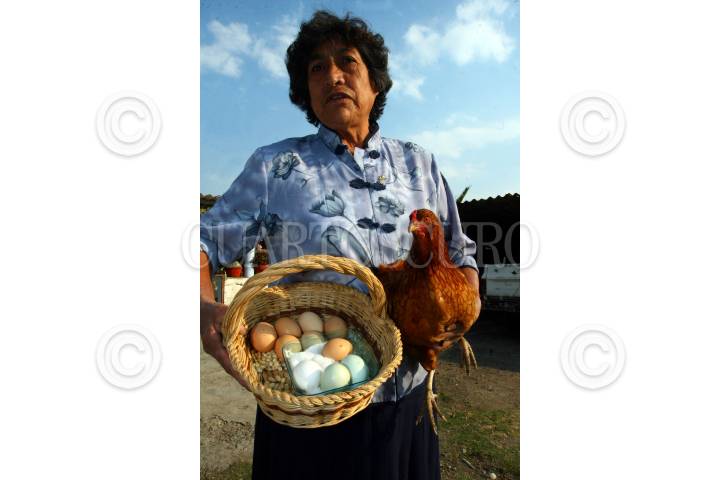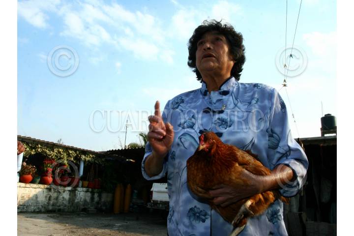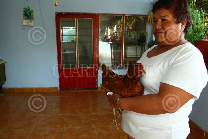 CUAUTITLÁN, ESTADO DE MÉXICO, 29ENERO2008.- La señora Elvira Romero muestra la gallina "Rabanita", la cual ha puesto huevos de color verde. FOTO: ISAAC ESQUIVEL/CUARTOSCURO.COM