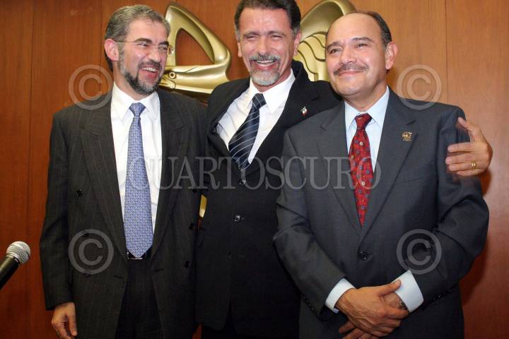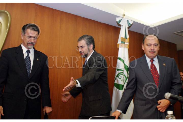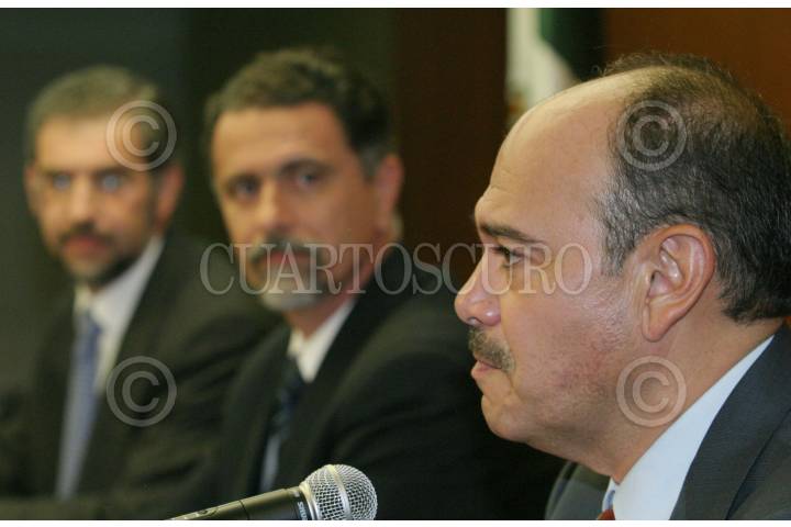 MEXICO, D.F. 12OCTUBRE2004.- Roberto Vega Gallina, líder del sindicato de SNTSS, Carlos María Abascal Carranza, secretario del Trabajo y Santiago Levy, director del IMSS, firmaron el acuerdo de un aumento salarial del 4% a los trabajadores del Seguro Social. FOTO: Moisés Pablo/CUARTOSCURO.COM