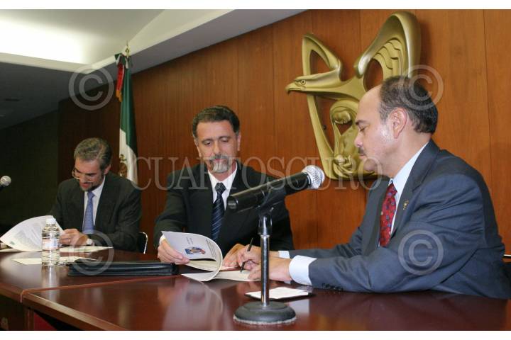 MEXICO, D.F. 12OCTUBRE2004.- Santiago Levy, director del IMSS, Carlos María Abascal Carranza, secretario del Trabajo y Roberto Vega Gallina, líder del sindicato de IMSS, firmaron el acuerdo de un aumento salarial del 3% a los trabajadores del Seguro Social. FOTO: Moisés Pablo/CUARTOSCURO.COM