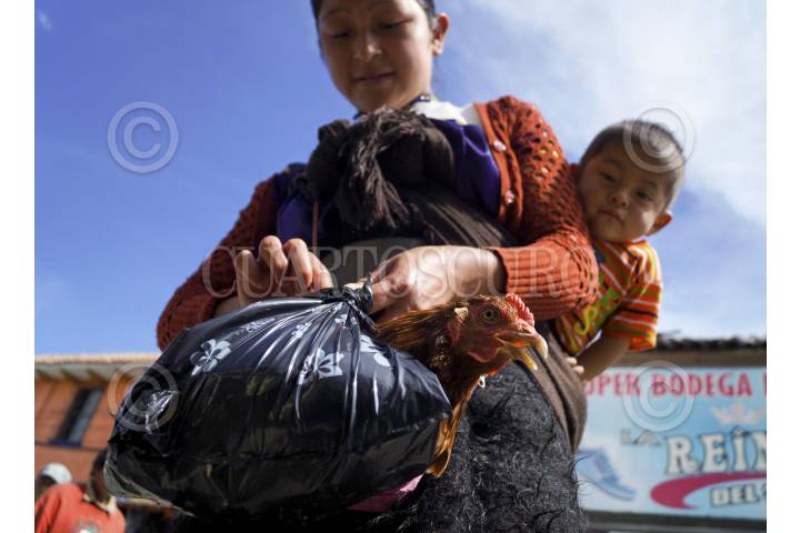 SAN CRISTOBAL DE LAS CASAS, CHIAPAS, 02ENERO2013.- Una mujer compra un gallo para la comida del día. El mercado de mayor tradición para los pobladores de la ciudad y de los pueblos cercanos se llama José Castillo Telmanz. San Cristobal de las Casas se localiza en la región "Altos de Chiapas", su población es cercana a los 200.000 habitantes y es tercero en economía y población en el Estado. Fundada en1528 fue una de las primeras poblaciones españolas en el Continente Americano. Capital de la Provincia de Las Chiapas desde la época colonial hasta el primer gobernador (1891), después los poderes estatales pasaron a Tuxtla Gutiérrez. Desde el levantamiento armado en 1994 por parte del Ejercito Zapatista de Liberación Nacional (EZLN) la ciudad se ha vuelto más cosmopolita y es considerada como la principal localidad turística de Chiapas. Cabe decir que antes de la aparición del grupo insurgente en la localidad había una fuerte tradición de desprecio a los pobladores indígenas que llegaban de los pueblos cercanos a vender y comprar sus mercancías, les era prohibido caminar por las banquetas de las calles. FOTO: ADOLFO VALTIERRA /CUARTOSCURO.COM