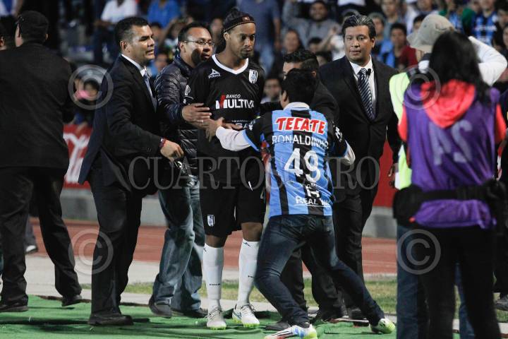 PUEBLA, PUEBLA, 28FEBRERO2015.- Aficionados invadieron el terreno de juego para intentar llegar al jugador Ronaldinho, durante el partido entre el Puebla de la Franja contra los Gallos Blancos de Querétaro, en juego correspondiente a la jornada 8 del torneo de clausura 2015, disputado en el estadio Universitario de la BUAP. FOTO: HILDA RÍOS /CUARTOSCURO.COM