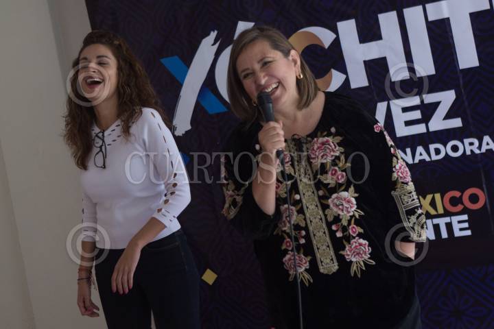 CIUDAD DE MÉXICO, 02ABRIL2018.- Xóchitl Galvez, candidata a senadora por el PAN, y Laura Ballesteros, su suplente al senado, durante una conferencia de prensa donde presentaron la Xóchicleta, y su closet de ropa dentro de su camioneta de campaña. FOTO: TERCERO DÍAZ /CUARTOSCURO.COM