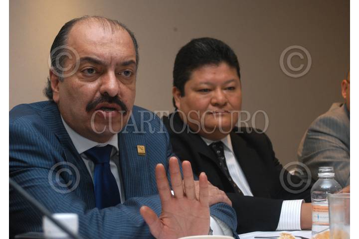 MÉXICO D.F. 20FEBRERO2007.- Tony Kuri Alam, presidente de la industria del vestido y Carlos Reyes Gámiz secretario general del PRD capitalino durante la conferencia donde se delaran en contra de la pirateria y a favor de la legalidad. FOTO: GUILLERMO PEREA/CUARTOSCURO.COM