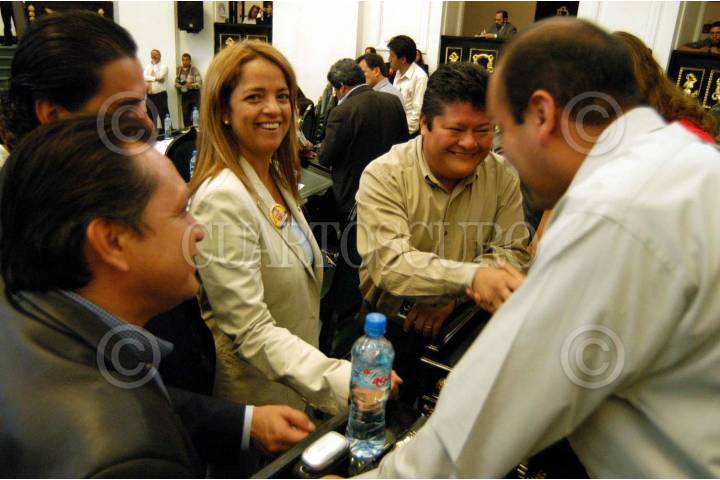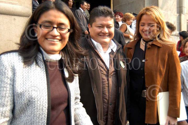 México, D.F. 02ENE2004.- Integrantes de la mesa directiva d la Asamblea Legislativa del DF, Silvia Oliva Fragoso (PRD), vicepresidenta, Jorge Lara (PAN), Roberto Carlos Reyes Gámiz (PRD), presidente y Javier Aguilar Álvarez (PRI), luego de tomar posesión de sus nuevos cargos. FOTO: Sandra Perdomo/CUARTOSCURO.COM