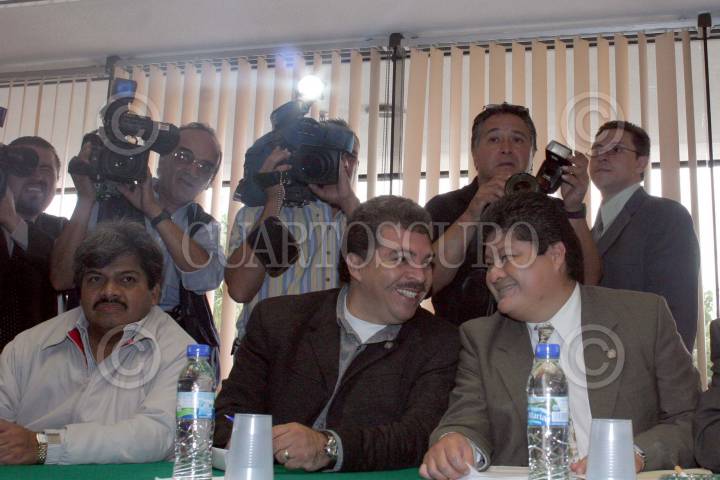 MEXICO, D.F. 03AGOSTO2005.- Al frente, Gerardo Fernández Noroña, Carlos Reyes Gámiz, presidente de la Comisión de Gobierno de la ALDF, René Arce y Juan Guerra, señalaron que a partir de hoy podrá definirse a los tres aspirantes del PRD a la jefatura del Gobierno capitalino como el Tucoi (Todos Unidos por la Izquierda). FOTO: Sandra Perdomo/CUARTOSCURO.COM
