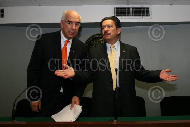 MÉXICO D.F. 12JUNIO2008.-Los senadores Gante Delgado de Convergencia y Carlos Navarrete del PRD durante la conferencia ofrecida a los medio en las instalaciones del Senado de la República. FOTO: GUILLERMO PEREA/CUARTOSCURO.COM