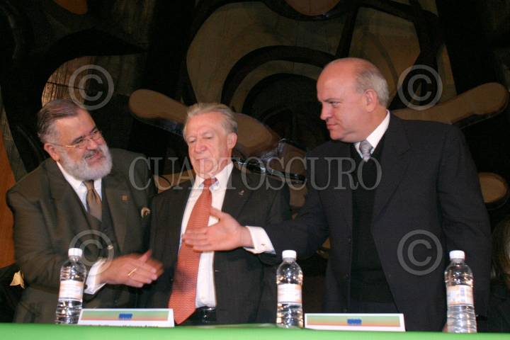 MEXICO, D.F., 18NOVIEMBRE2005.- José Luis Soberanes, presidente de la Comisión Nacional de Derechos Humanos, Guillermo Arzac, intregrante del Consejo Ciudadano y Jaime Moreno Garavilla, diputado de Convergencia, durante la firma del Acuerdo Nacional "Mejor Sociedad, Mejor Gobierno", que se realizó en el Polyforum Siqueiros. FOTO: Moisés Pablo/CUARTOSCURO.COM
