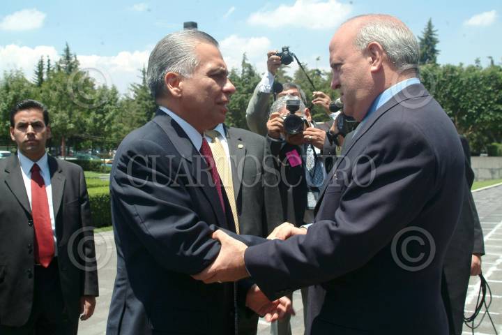 MEXICO, D.F. 05AGOSTO2004.- Rafael Macedo de la Concha, Procurador General de la República, saluda a Jaime Miguel Moreno Garavilla, presidente de la comisiòn cudadana enn la Cámara de Diputados, previo a iniciar la ponencia magistral. FOTO: Iván Stephens/CUARTOSCURO.COM