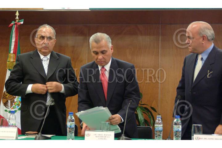 MEXICO, D.F. 05AGOSTO2004.- Bitar Haddad, diputado, Rafael Macedo de la Concha, Procurador General de la República, y Jaime Miguel Moreno Garavilla, presidente de la comisión cudadana en la Cámara de Diputados, previo a iniciar la ponencia magistral del Procurador. FOTO: Iván Stephens/CUARTOSCURO.COM