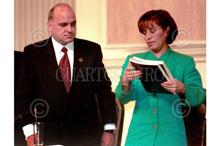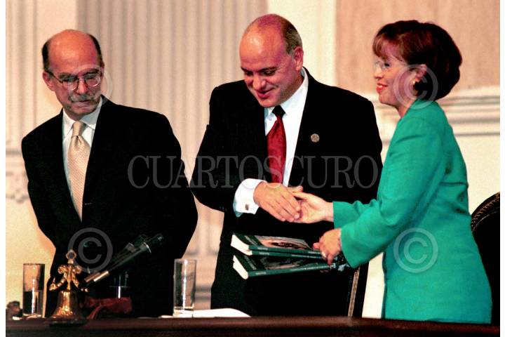 Rosario Robles al momento en que entrega su informe a Jaime Moreno Garavilla presidente de la mesa directiva de la II Asamblea Legislativa del D.F. FOTO: Victoria Valtierra/CUARTOSCURO.COM