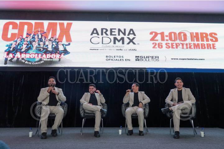 CIUDAD DE MÉXICO 10JUNIO2025.- Salvador Arzarte, Julio Haro, Esaul, García y Juan Carlos, integrantes de la Arrolladora Banda Limón, durante su conferencia a medios de comunicación en la Arena Ciudad de México. FOTO:ROGELIO MORALES /CUARTOSCURO.COM