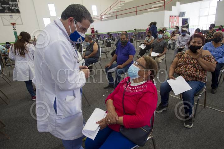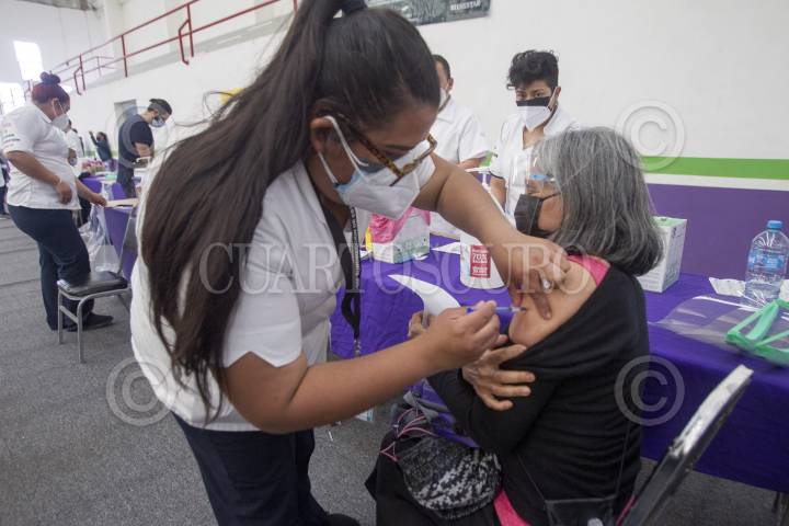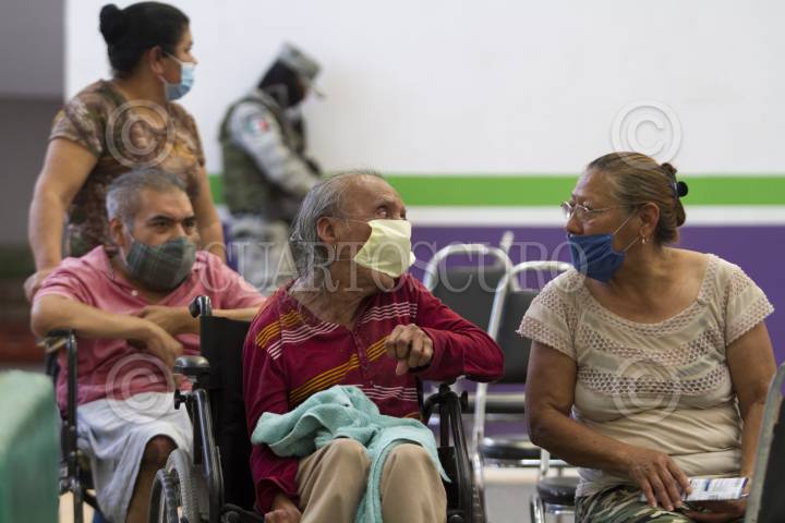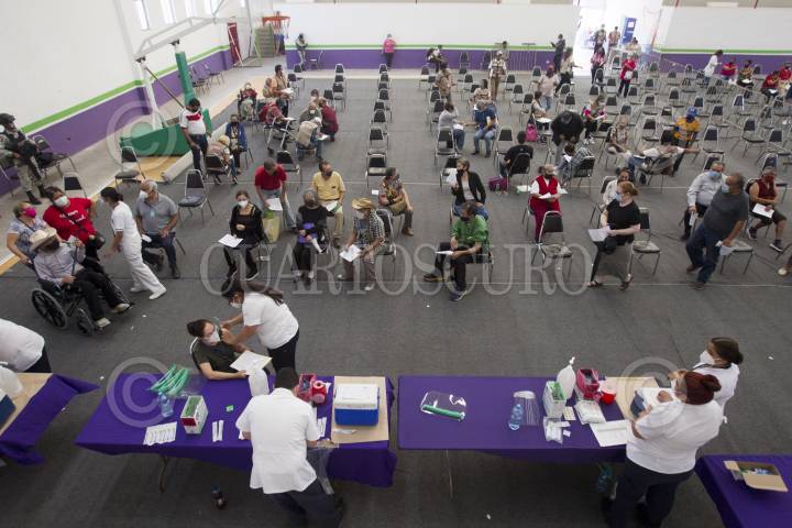 Cientos de adultos mayores reciben la vacuna contra Covid-19 en módulos instalados en un gimnasio local. Se destinaron 9 mil, 700 dosis para el municipio de García, las cuales se aplicarán durante los próximos tres días.