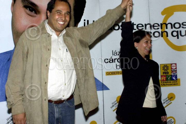 Lázaro Cárdenas Batel, candidato al gobierno de Michoacán y Amalia García, lider nacional del PRD levantan los brazos en señal de triunfo, basandose en los resultados preliminares del PREP que le dan una ligera ventaja sobre Alfredo Anaya del PRI. FOTO: Oswaldo Ramírez/Enviado/CUARTOSCURO.COM