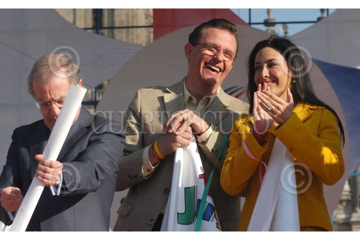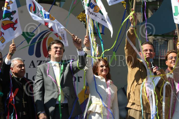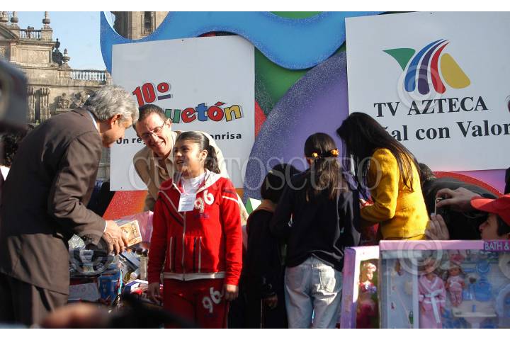 MEXICO D.F. 06ENERO2004.- En el zócalo, el conductor de TV Azteca Jorge Garralda, en compañía de Andrés Manuel López Obrador, jefe de gobierno del DF, y María Laura Medina de Salinas, dieron el banderazo para repartir juguetes a distintas instituciones como parte del décimo Juguetón. FOTO: Germán Romero/CUARTOSCURO.COM
