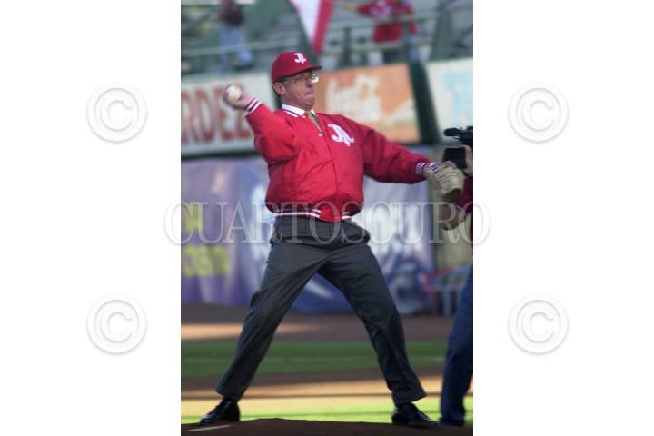 Jorge Garralda, conductor de A quien corresponda, lanza la primera bola del duelo entre los Diablos rojos del México y los Tigres de Puebla en el foro Sol. FOTO: Juan Pablo Zamora/CUARTOSCURO.COM