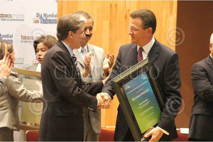 MÉXICO, D.F. 31MAYO2006.- Julio Frenk Mora, secretario de Salud, le otorgó a Jorge Garralda, conductor de televisión, un reconocimiento por su esfuerzo en el fomento de ambientes libres de humo de tabaco. FOTO: Iván Stephens/CUARTOSCURO.COM