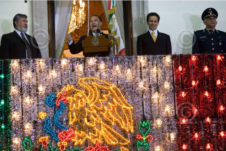 QUERETARO, QUERETARO, 15SEPTIEMBRE2009.- Francisco Garrido, gobernador de la entidad, realizó su ultima ceremonia del Grito de Independencia en su mandato, sin la presencia de su esposa Marcela Torres, diputada federal. Al evento le acompañaron el Presidente del Supremo tribunal de Justicia Jesúas Garduño, El presidente de la mesa directiva del congreso estatal Ricardo Martínez Rojas Rustriany Uribe Toledo Sibaja, General de Brigada, Diplomado de Estado Mayor, comandante de la 17a zona militar. Este evento estuvo enmarcado por la especulación de un anuncio de presunta amenaza de bomba. FOTO: DEMIÁN CHÁVEZ/CUARTOSCURO.COM