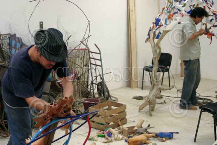 OAXACA, OAXACA, 10NOVIEMBRE2009.- Mauricio Garrido, (Santiago de Chile, 1974), y Erick Miraval, (Huánuco, Perú, 1982), artistas plásticos, preparan una de sus obras a exponer en lo que será la Segunda Muestra Internacional de Arte Iberoamericano que celebrará en el Centro Nacional de las Artes (CENART) el próximo 29 de noviembre. El forma parte de la segunda promoción de la residencia para artistas iberoamericanos realizada por el Fondo Nacional para la Cultura y las Artes (FONCA) y se prepara en el Centro de las Artes de San Agustin (CASA) en Oaxaca. FOTO: MISAEL VALTIERRA/CUARTOSCURO.COM