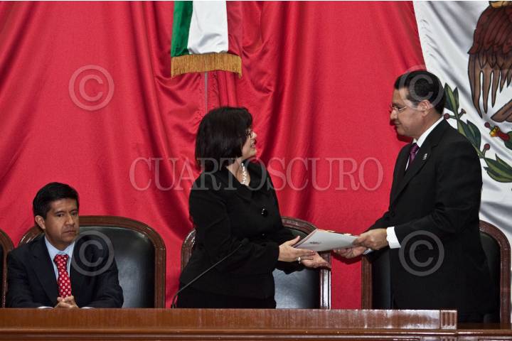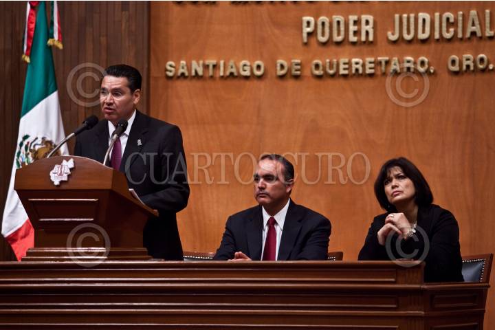 QUERÉTARO, QUERÉTARO, 08JULIO2010.- Jorge Herrera Solorio, magistrado presidente del Tribunal Superior de Justicia, acompañado de Dalia Garrido, presidenta de la Mesa Directiva de la LVI Legislatura, y el gobernador del estado, José Calzada; presentó su informe de actividades ante el pleno de la legislatura y en evento masivo en el Teatro de la República como marco de la rendición de cuentas del Poder Judicial del Estado. FOTO: DEMIAN CHÁVEZ/CUARTOSCURO.COM
