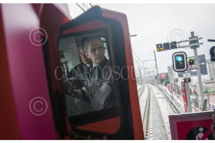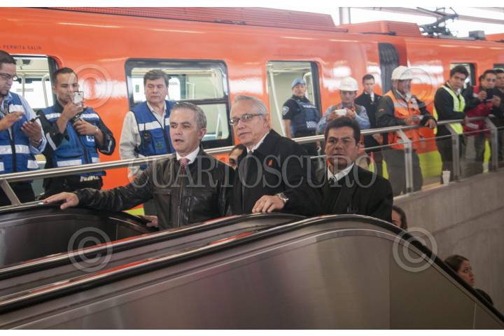 MÉXICO, D.F., 28OCTUBRE2015.- Miguel Ángel Mancera, jefe de gobierno capitalino; director del STC Metro, Jorge Gaviño; Edgar Tungüi, secretario de Obras del Distrito Federal y Dione Anguiano, delegada de Iztapalapa, realizaron un recorrido en un convoy del metro de la estación Periférico Oriente hacia Culhuacán para poner en operación dicho tramo de 5 estaciones de la línea dorada, el cual fue reabierto al público de forma gratuita, camiones del servicio RTP seguirán brindando servicio gratuito de Periférico hacia Tláhuac. FOTO: DIEGO SIMÓN SÁNCHEZ /CUARTOSCURO.COM