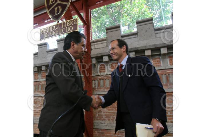 MÉXICO, D.F., 09DICIEMBRE2008.- Jesús Ortega, dirigente nacional del PRD y José Gaxiola, director de la Escuela Libre de Derecho, se despiden al finalizar una conferencia magistral que realizó el perredista en dicha institución ubicada en la Colonia Doctores. FOTO: MOISÉS PABLO/CUARTOSCURO.COM