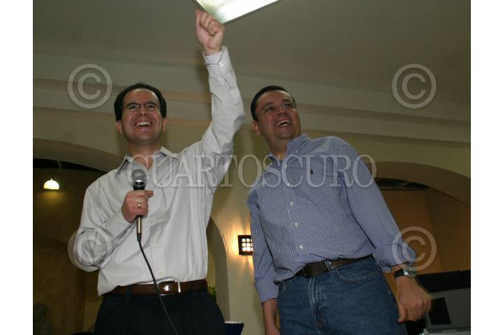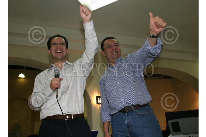 LEÓN, GUANAJUATO, 02JUNIO2007.- Cesar Nava, Secretario Particular y Gemán Martínez, Secretario de la Función Pública, celebran sus respectivas victorias en las elecciones para integrantes del Consejo Nacional en le XX Asamblea Nacional del PAN. FOTO: MOISÉS PABLO/CUARTOSCURO.COM