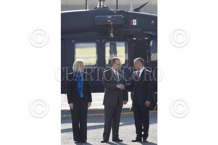 MÉXICO, D.F., 08DICIEMBRE2011.- Carol Z. Pérez, subsecretaria de a Oficina Internacional de Suntos Antinarcóticos y Aplicación de la Ley, Anthony Wayne, embajador norteamericano, y Génaro García Luna, secretario de Seguridad Pública Federal, durante la ceremonia de entrega de un helicóptero tipo UH-60M Black Hawk por parte del gobierno estadunidense a la Secretaria de Seguridad, en el marco del Plan de Cooperación Mérida. Esta aeronave servirá para el combate al crimen organizado y se recibió en el Centro de Alto mando de la Policía Federal. FOTO: MOISÉS PABLO/CUARTOSCURO.COM