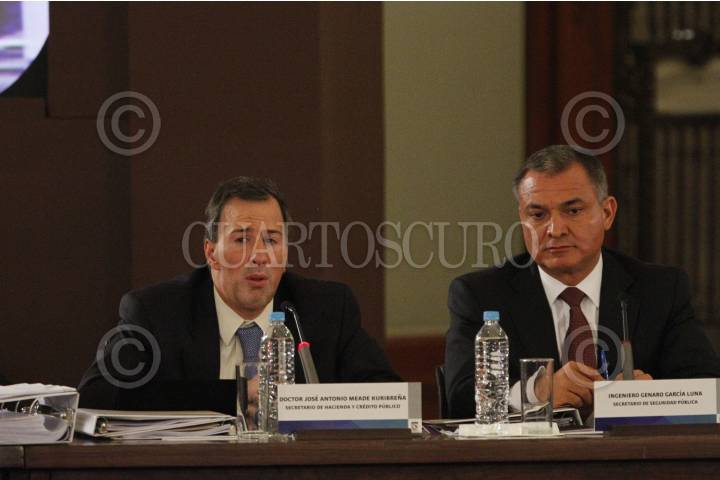MÉXICO, D.F., 16DICIEMBRE2011.- José Antonio Meade Kuribeña, secretario de Hacienda y Crédito Público, y Genaro García Luna, secretario de Seguridad Pública, durante los trabajos de la primera sesión extraordinaria del Consejo Nacional de Seguridad Pública, en el Palacio Nacional. FOTO: MOISÉS PABLO/CUARTOSCURO.COM